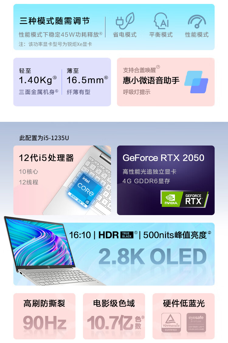配置:i5-12500H 16GDDR5 512G固态硬盘 2240x1400DPI 16:9 14英寸防窥屏