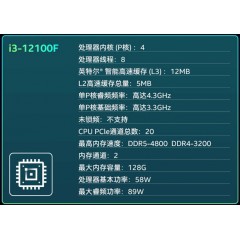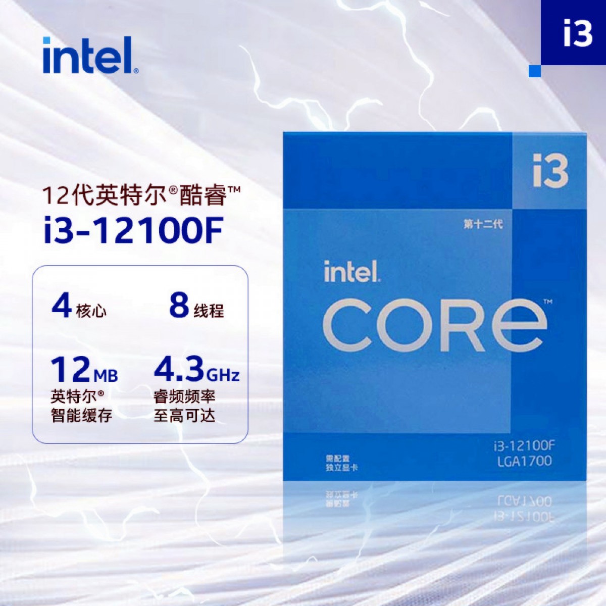 英特尔(Intel) i3-12100F 12代 酷睿 处理器 4核8线程 单核睿频至高可达4.3Ghz 台式机CPU