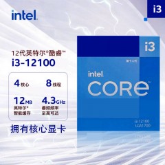 英特尔(Intel) i3-12100 12代 酷睿 处理器 4核8线程 单核睿频至高可达4.3Ghz 12M三级缓存增强核显 盒装CPU