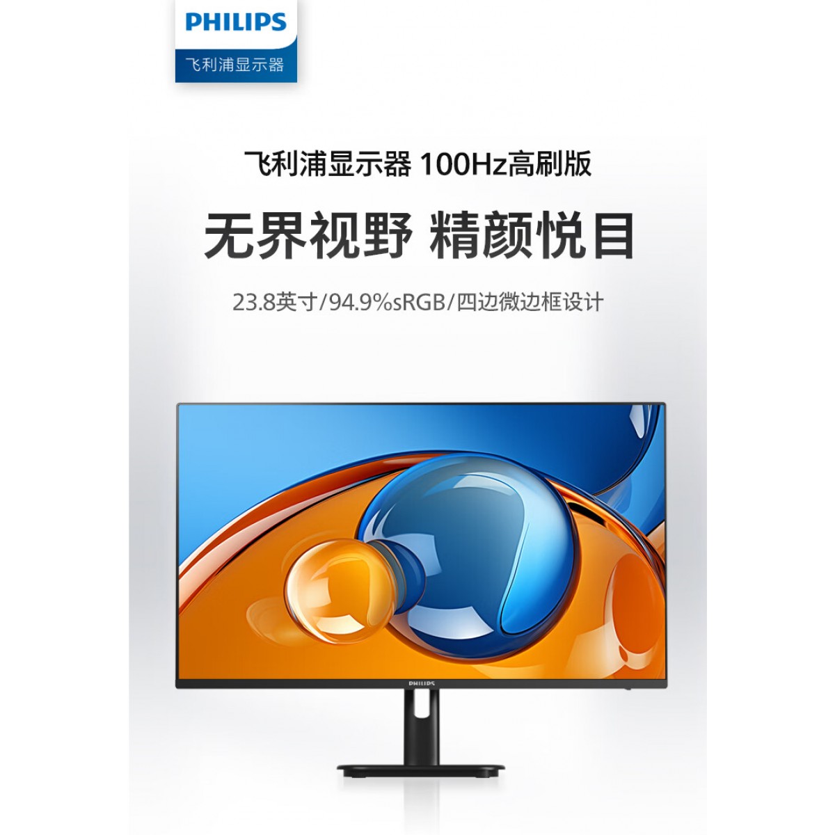飞利浦 23.8英寸LGD-IPS全面屏100Hz 1ms全高清节能认证低蓝光VGA/HDMI/DV商用办公娱乐显示器24E1N1100D
