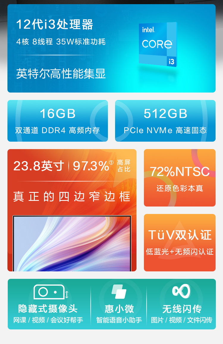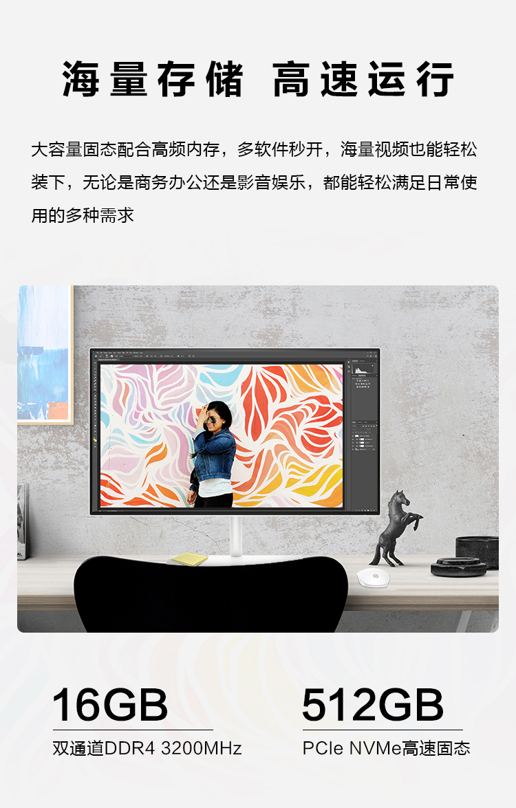 高性能娱乐商务电脑 家用高效学习现代化办公台式一体机电脑( I3-12100T/16GB /512G SSD固态硬盘/白