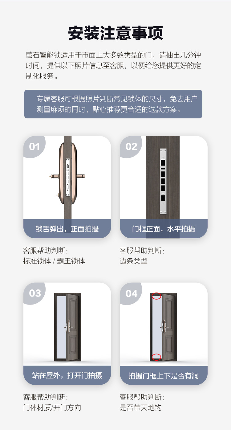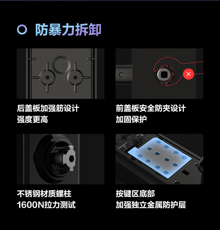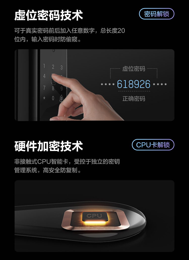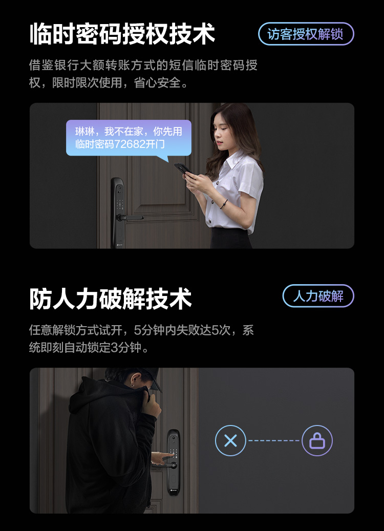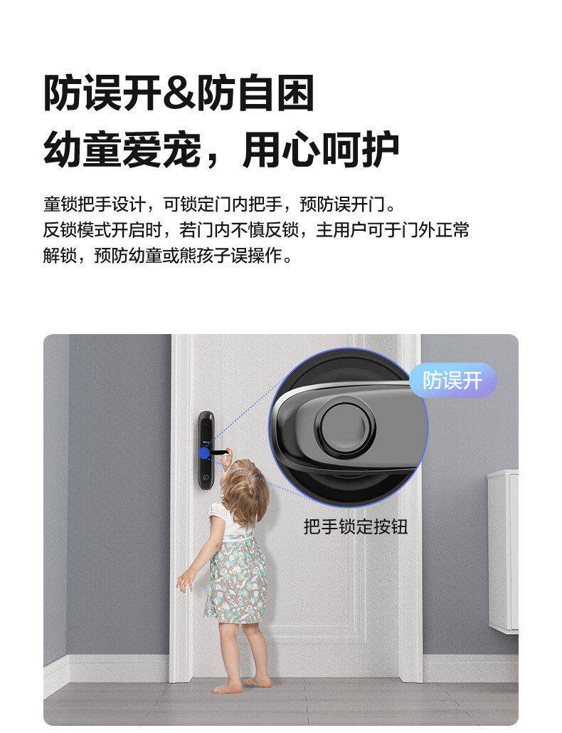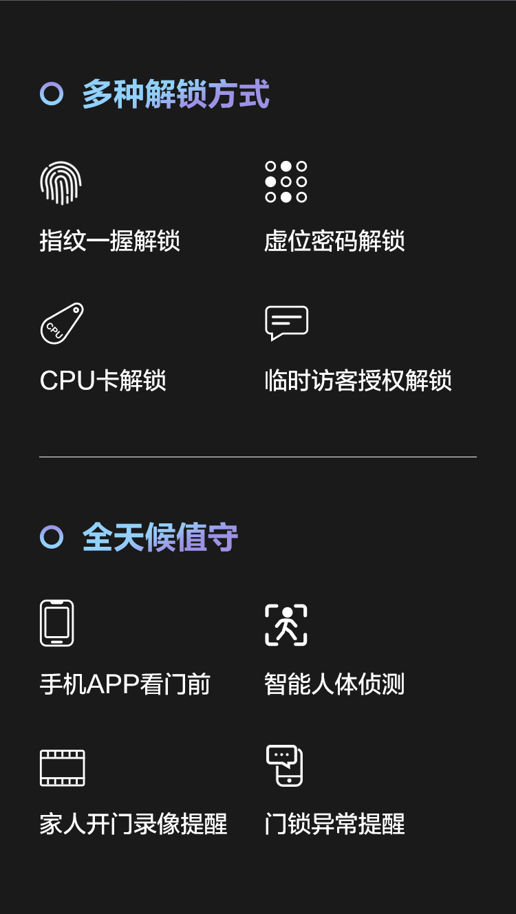 集成电子猫眼 | 指纹(一握开)| 密码感应卡 | 机械钥匙 | 临时密码