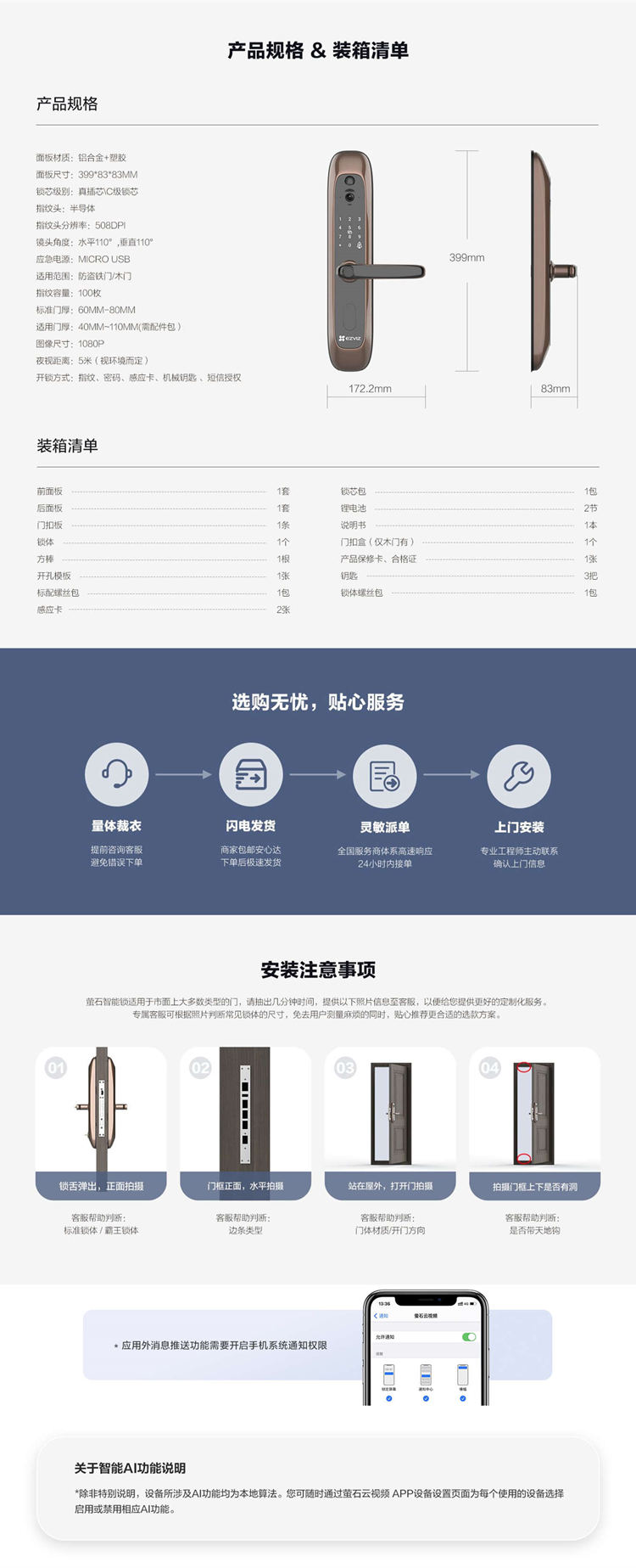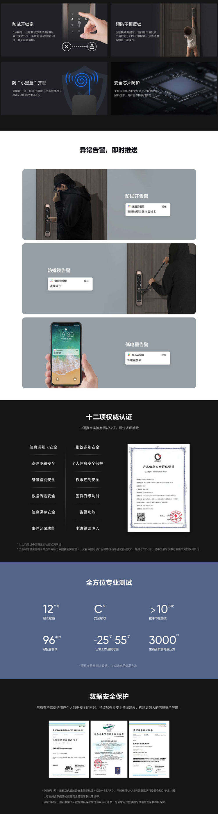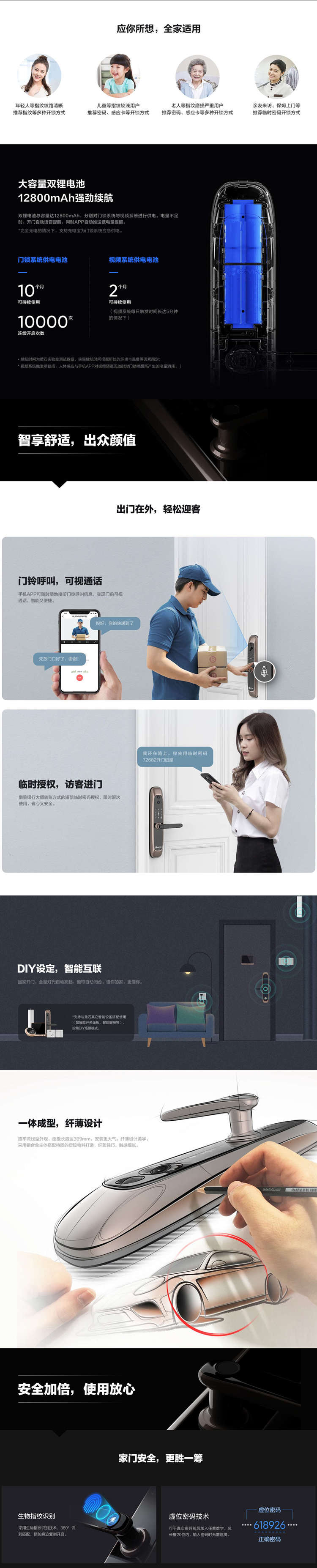 指纹 | 密码 | 刷卡 | 离合锁体 | 真插芯结构 |智能可视门锁 | 机械钥匙开锁