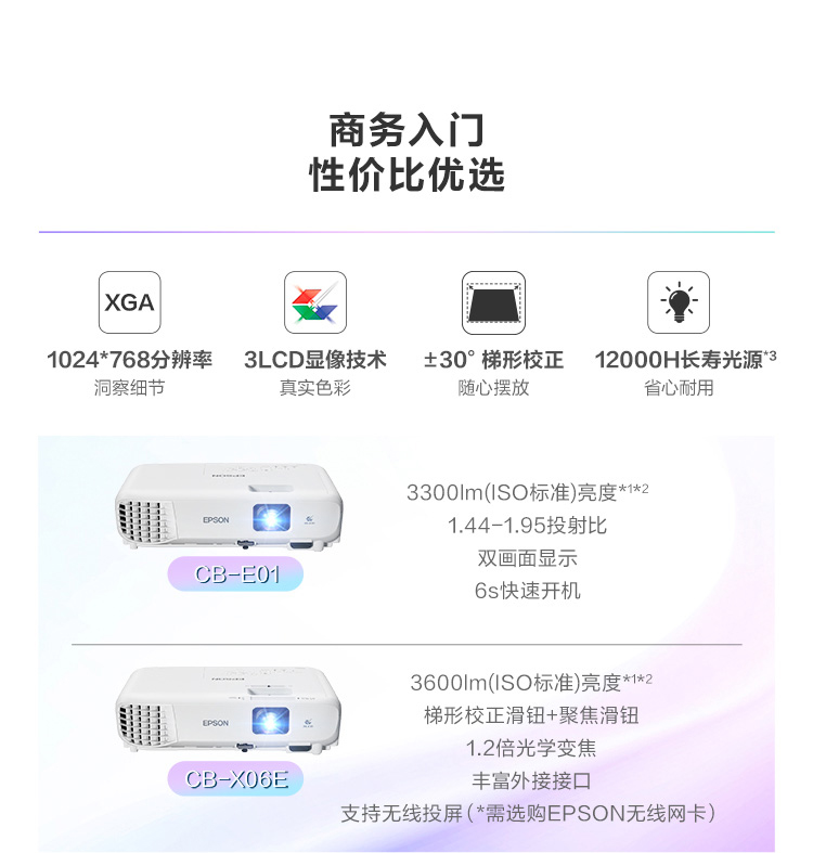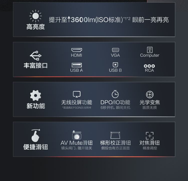 标清XGA | 3600流明 | 光学变焦 | 支持侧投