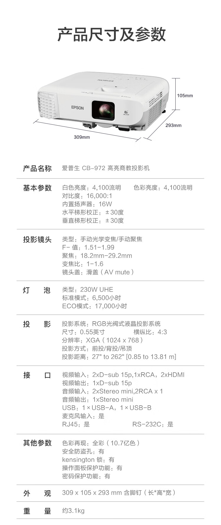 商品名称:爱普生(EPSON)CB-972 投影仪 投影机