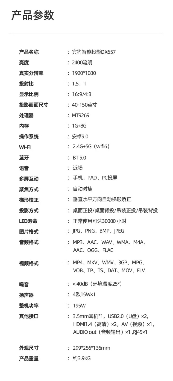 商品名称:宾狗智能投影仪DX657 高清家庭影院