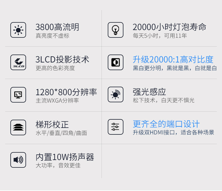 亮度3800流明 | 对比度 20000:1 | 分辨率 1280*800