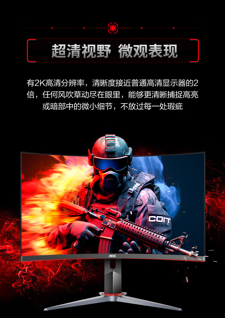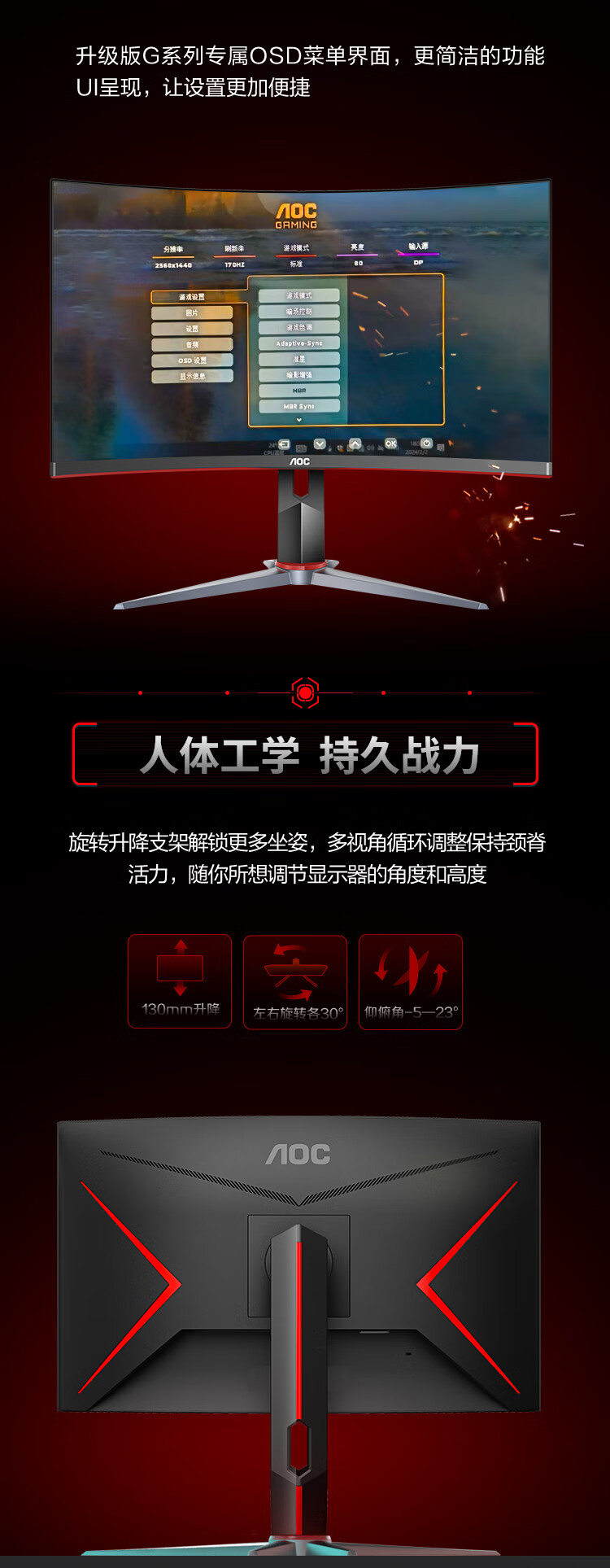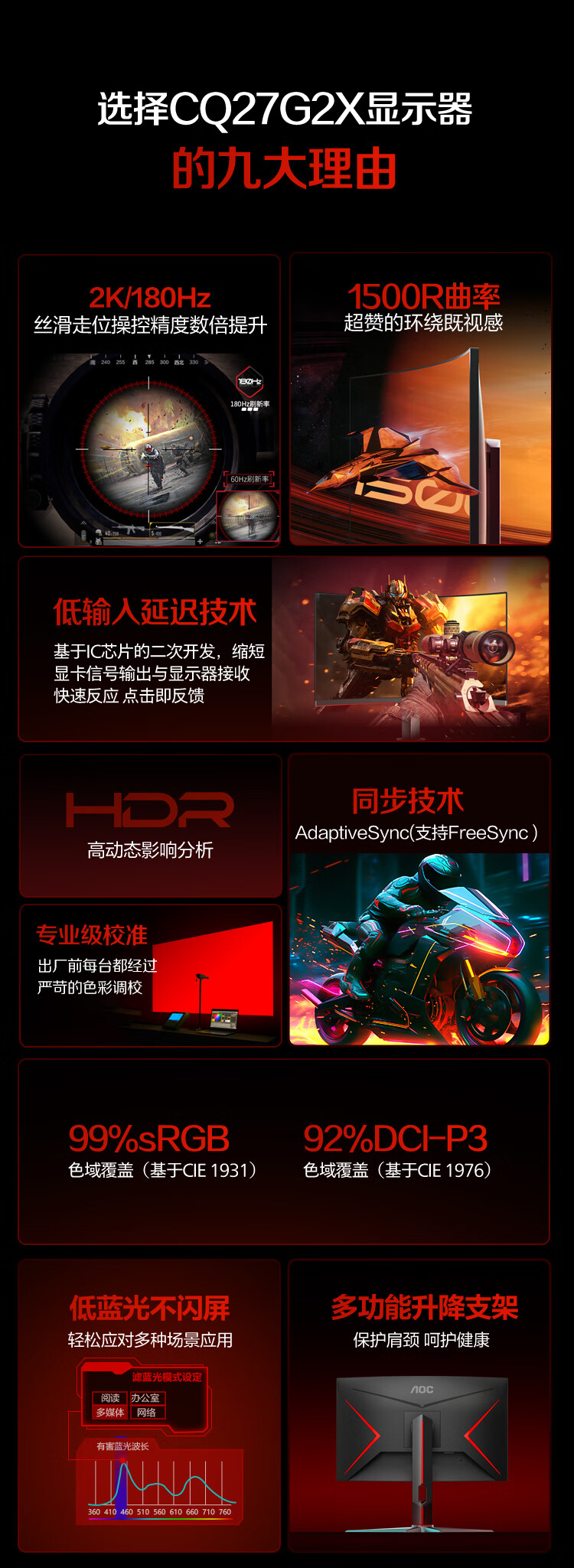 商品名称:AOC 27英寸 2K高清 180Hz HDR10 快速液晶1ms 广色域 旋转升降 曲面电竞电脑显示器
