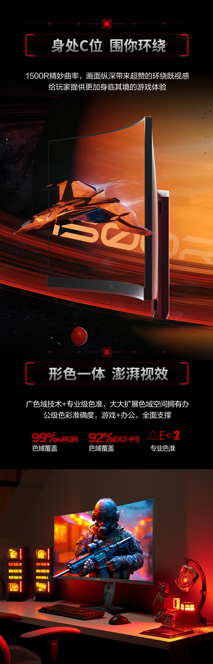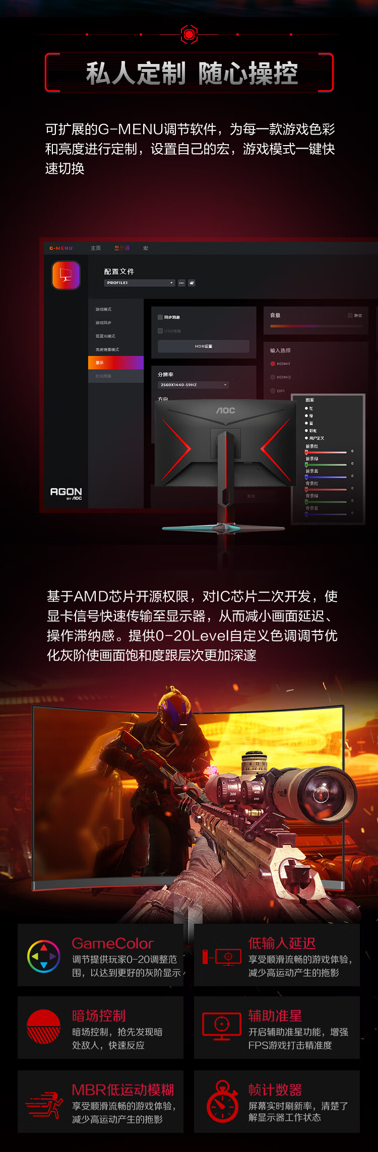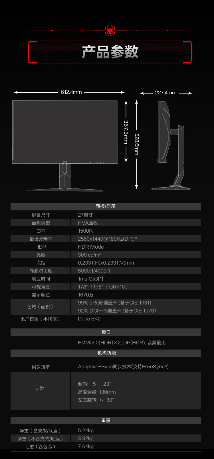商品名称:AOC 27英寸 2K高清 180Hz HDR10 快速液晶1ms 广色域 旋转升降 曲面电竞电脑显示器