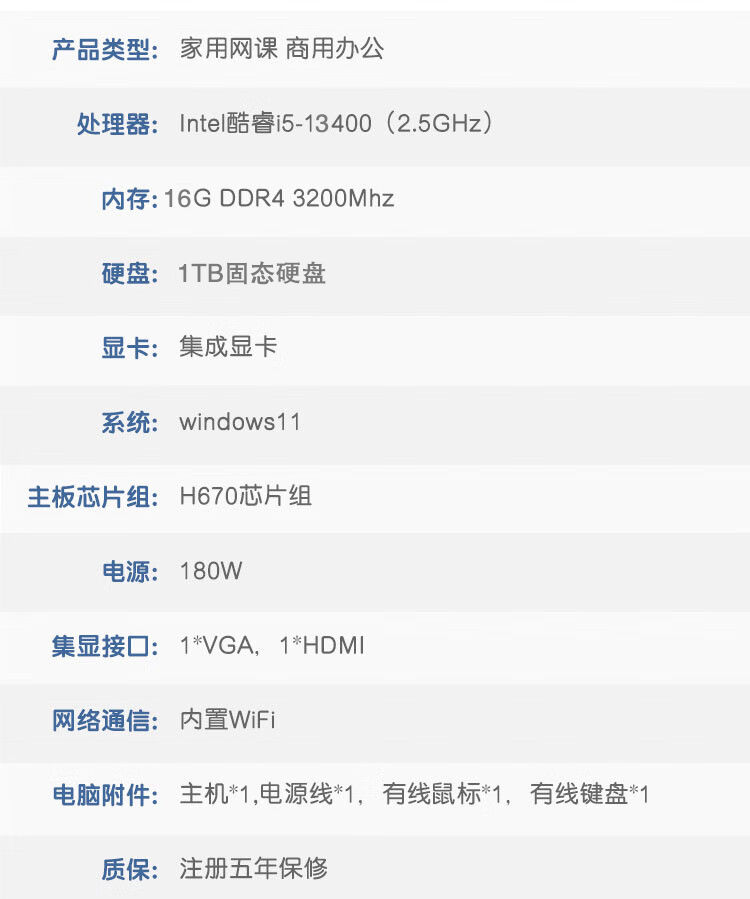 intel 13代i5-13400 16G内存 1TBSSD固态硬盘 集显 (定制)