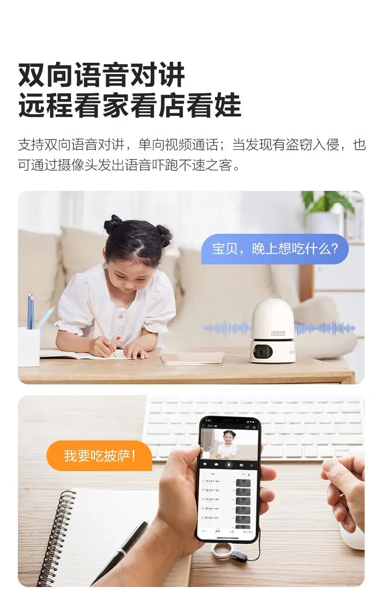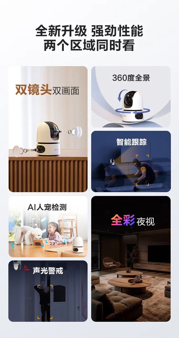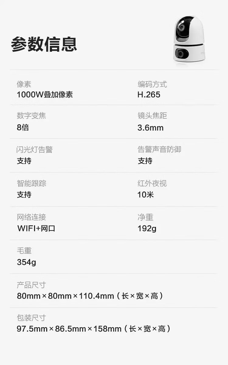 有效像素:10MP(3MP+3MP) | 双向语音对讲、数字变焦、AI人形/宠物检测、隐私遮挡模式、智能跟踪
