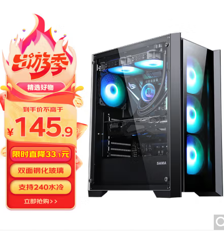 先马(SAMA)光之神 黑色 中塔式台式电脑主机箱 双面玻璃/6风扇位/支持ATX主板、240水冷位/三面防尘网