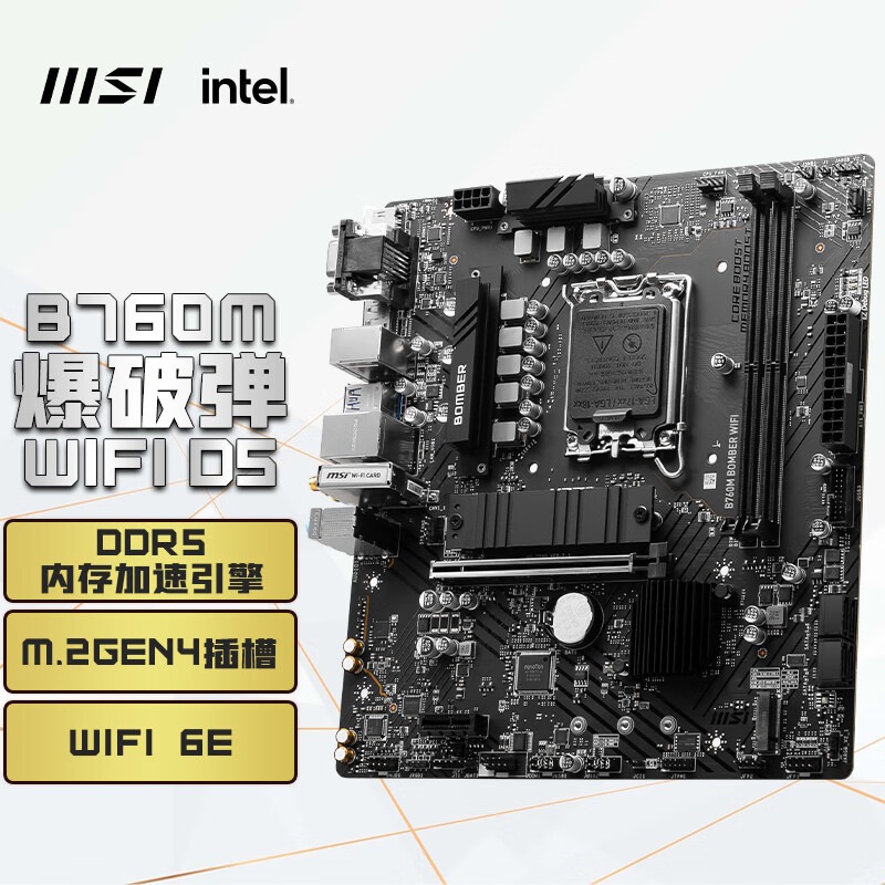 微星(MSI)B760M BOMBER WIFI DDR5爆破弹电脑主板 支持 CPU 14400F/13490F/12600KF (INTEL B760/LGA 1700)