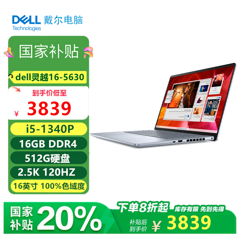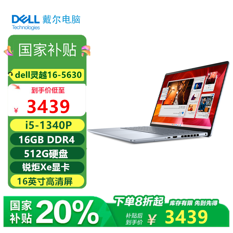 (国补)戴尔(DELL)灵越16- 5630 16英寸大屏13代酷睿轻薄笔记本电脑家用商务办公 i5-1340P 锐炬Xe显卡 高清屏 16G内存 512G固态